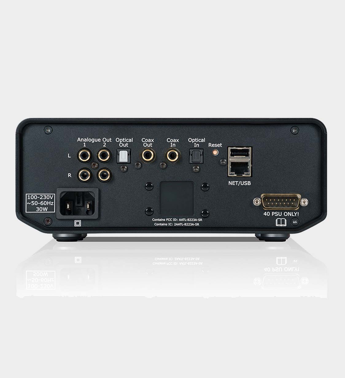 Pour aller plus loin, le 40 ST dispose d’un connecteur arrière 15 broches pour l’alimentation externe 40 PSU. Cette alimentation torique dédiée communique avec le streamer via un microprocesseur intégré, distribue plusieurs tensions numériques contrôlées et assure un courant ultra-stable et exempt de bruit.