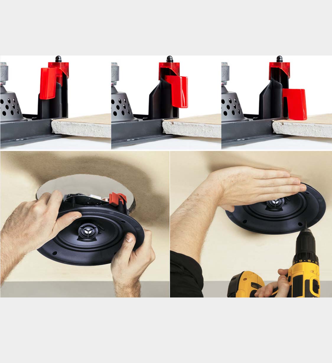Un système de verrouillage de montage simple mais robuste permet une installation rapide et sans problème. Les trous de vis empochés aident à maintenir la perceuse stable, ce qui rend l’installation facile. Lorsqu’ils ne sont pas utilisés, les verrous de montage sont maintenus de manière sécurisée dans un boîtier autonome. Une fois mis en place, ils couplent fermement le châssis au plafond ou au mur, augmentant ainsi la rigidité des surfaces. Si jamais retirés, les verrous se rétractent et se verrouillent dans leurs logements. Chaque enceinte comprend un gabarit d’installation en taille réelle avec instructions de référence rapide, ainsi que des guides découpés à la matrice pour marquer le trou de découpe.