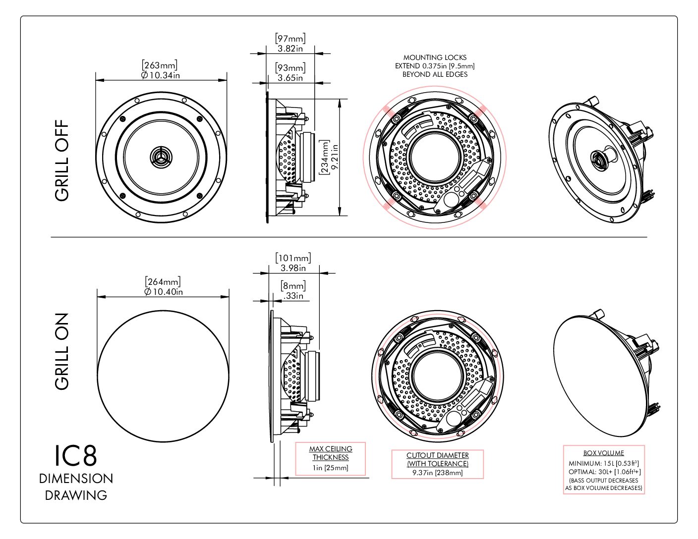 Idéal pour toutes les pièces, le haut-parleur de plafond IC8 mesure moins de 10,5 pouces une fois installé, ce qui allie à la perfection performances et une discrète empreinte. Un woofer robuste de 8 pouces offre des performances puissantes et dynamiques à basses fréquences